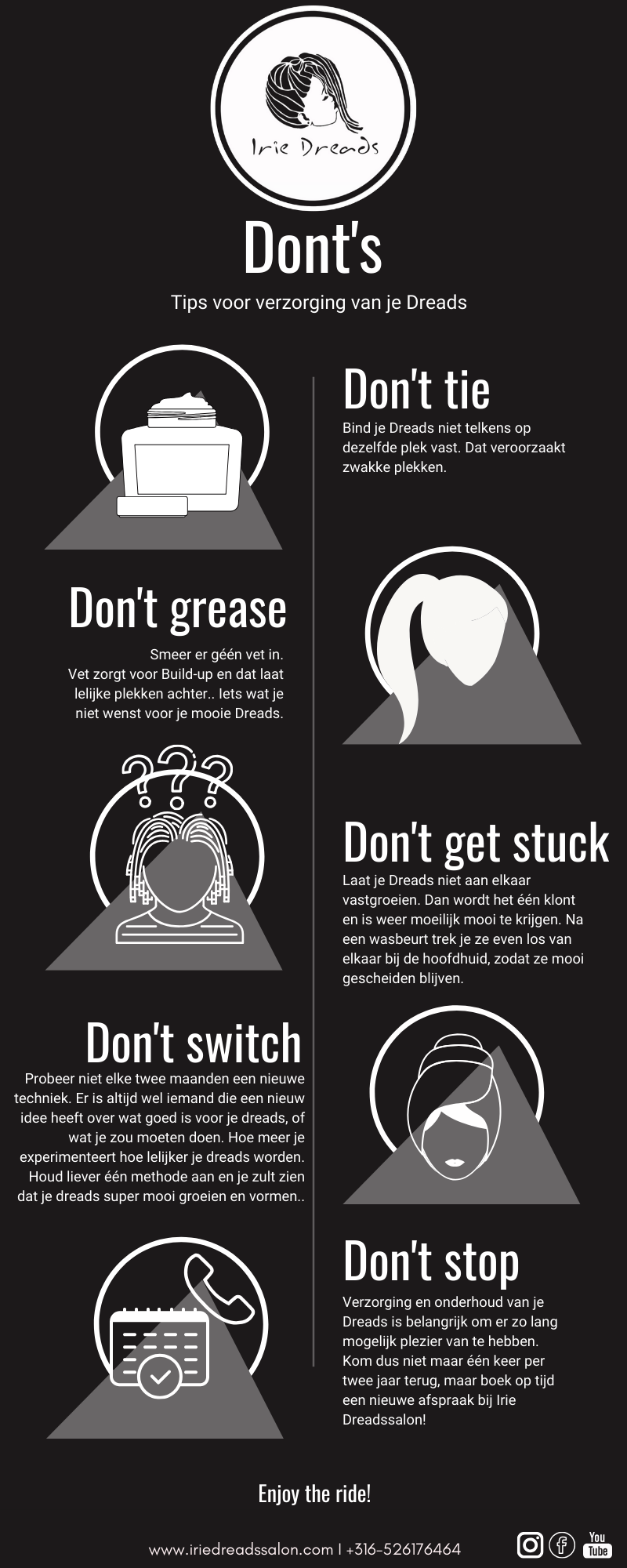 -  Wat zijn de Do’s met dreads?Enjoy the ride!! Dreads zijn een verlengstuk van jezelf, jouw wortels, jouw roots, deze groeien vanuit jou om gezien te worden. Laat ze hun gang gaan, forceer niks, niks is perfect zo ook je dreadlocks niet. Niet elk haartje hoeft perfect strak in de dread te zitten maar zie het als een eigenwijs haartje dat het leuker vindt om op te vallen. Maak minimaal elke 3 maanden een afspraak voor het bijwerken van je dreads, zo houd je de vakjes gescheiden, de uitgroei goed en rond bijgewerkt en kunnen wij je tips en trics geven waar nodig. Was ze elke 2 weken tot een maand. Maak er een standaard ‘wasdag’ van, zodat je ze schoon houdt en ze lekker ruiken. Er zijn vele natuurlijke shampoos te koop. Wij verkopen Dr. Bronner shampoo bij Irie Dreads en deze ruiken super lekker! Verzorg je hoofdhuid, smeer 'm in met wat natuurlijke olie, deze hebben wij in de salon te koop. Palmrol je dreads 1 x per week zodat ze mooi rondblijven. Versier ze met schelpjes, kraaltjes, touwtjes maak er een feestje van! Op ons YouTube kanaal vind je leuke Tips & Tricks!